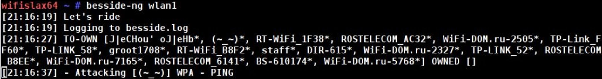 Besside-ng достаточно интеллектуальная программа. Она умеет не только автоматически захватывать рукопожатия, самостоятельно деаутентифицируя клиентов, но и отсевает заведомо бесперспективные точки доступа (слишком слабый сигнал, нет клиентов). При этом программа запоминает ТД для которых она уже захватила рукопожатие и больше их не беспокоит. Время от времени программа проводит дополнительные сканирования и добавляет вновь обнаруженные ТД.