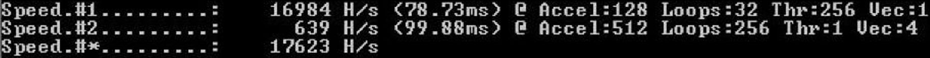 Теперь скорость отображается тремя строчками - для каждого устройства и их сумма. Кстати, «Hashmode: 2500 - WPA-EAPOL-PBKSF2» показывает скорость перебора для хэшей от WiFi. А по ссылке -