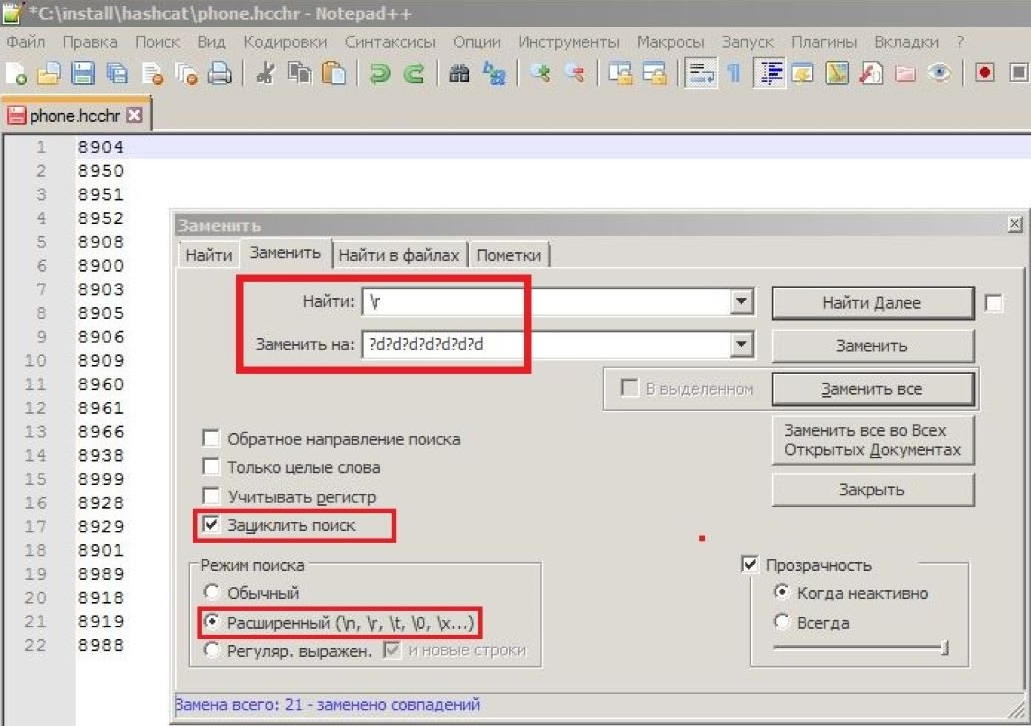 Такая маска дает 1 000 000 000 комбинаций и захватывает много лишних номеров. Лучше создать маску только для номеров нашего региона. Для этого создадим в папке hashcat файл с именем phone.hcchr откроем его блокнотом и напишем маски телефонов. Сами номера легко можно нагуглить по запросу «коды операторов московской области». Если сами коды переписать в столбик не долго, то что бы не мучиться с добавление маски нажмите ctrl+H и заполните все как здесь: