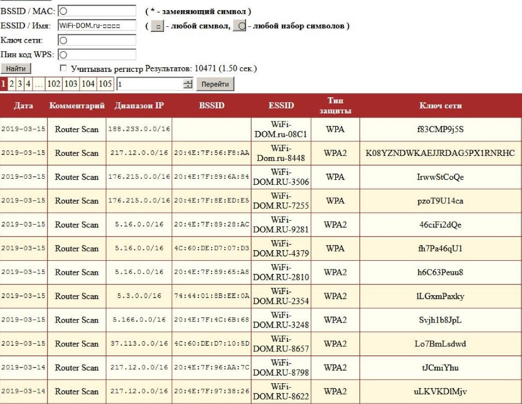 . Нам нужно будет войти в систему, можно использовать гостевой пароль antichat:antichat. И переходим в раздел «поиск». Во-первых, здесь можно проверить есть какая-то сеть из наших сетей в базе написав в поле «BSSID» мак роутера. Его можно посмотреть в RouterScan. Можно это сделать из меню самой программы, но не хочется давать ей доступ к этому сайту (мы в самом начале запретили ей это делать). Во-вторых, посмотрим примеры паролей. Допустим у нас много сетей с названием «WiFi-DOM.ru-ХХХХ». Заполняем как на картинке и нажимаем найти:И мы видим, что эти психи в пароле используют 10 символов где есть цифры, буквы в нижнем регистре и верхнем. Это слишком много комбинаций и такое нам не нужно. А вот в «TP-LINK_□□□□□□»: