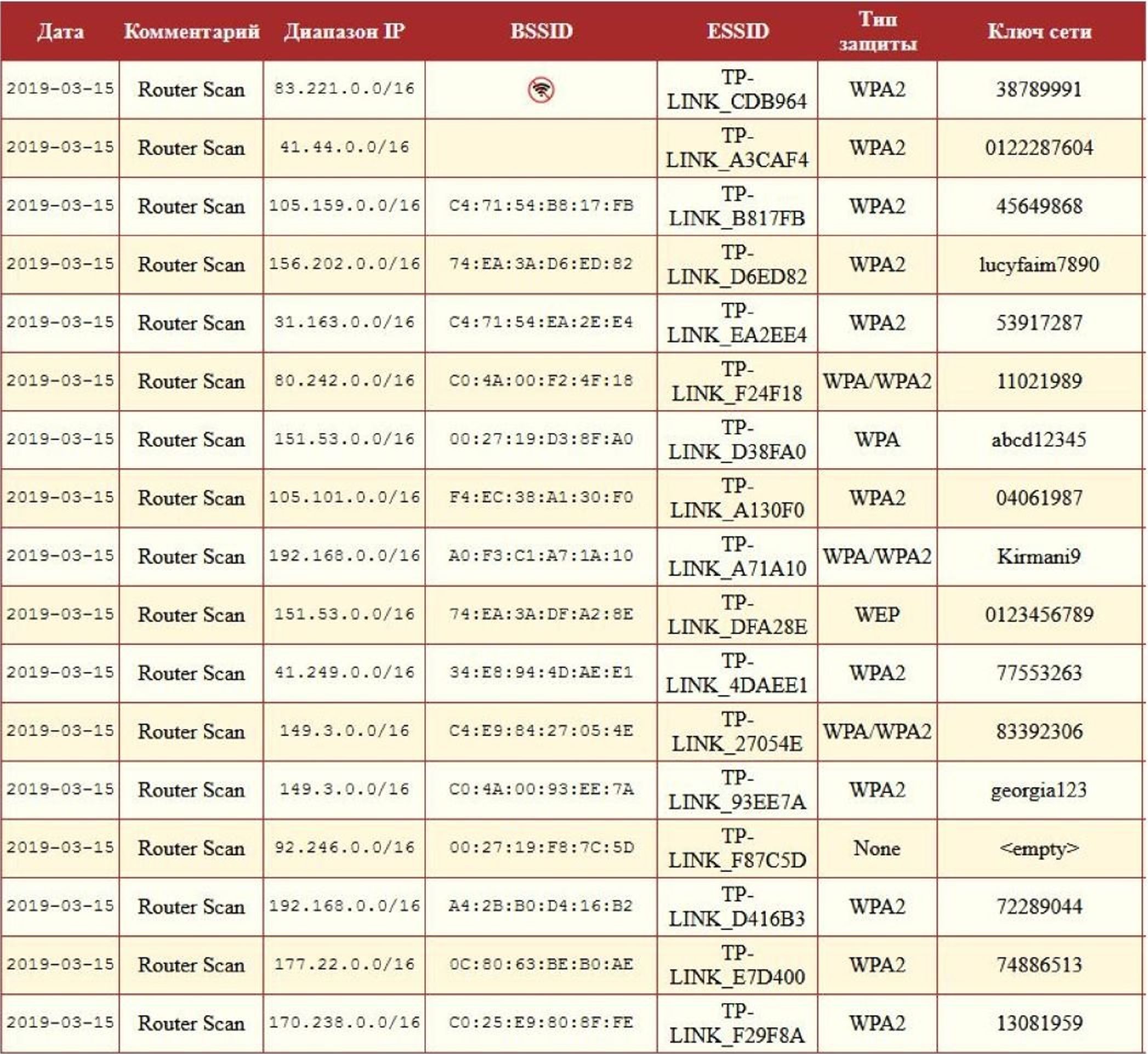 Маски можно составлять не только по телефону. Достаточно эффективно составить маску по модели роутера. Роутер с завода имеет название сети по типу SSID_XXXX, где SSID это название производителя, а ХХХХ последние цифры мака (да, это именно цифры, но в шестнадцатеричной системе счисления). Чтобы узнать по какой маске формируется пароль нужно посмотреть на уже взломанные роутеры.