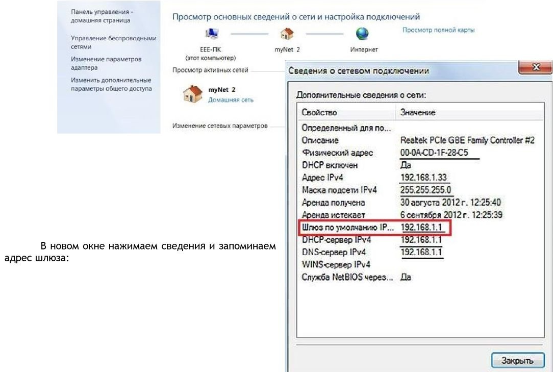 Теперь будет полезным отключить журнал в настройках роутера. Для этого нужно подключиться к точке и узнать адрес его веб морды (шлюз). Для этого идем в Панель управления\Центр управления сетями и общим доступом\ выбираем нашу сеть: