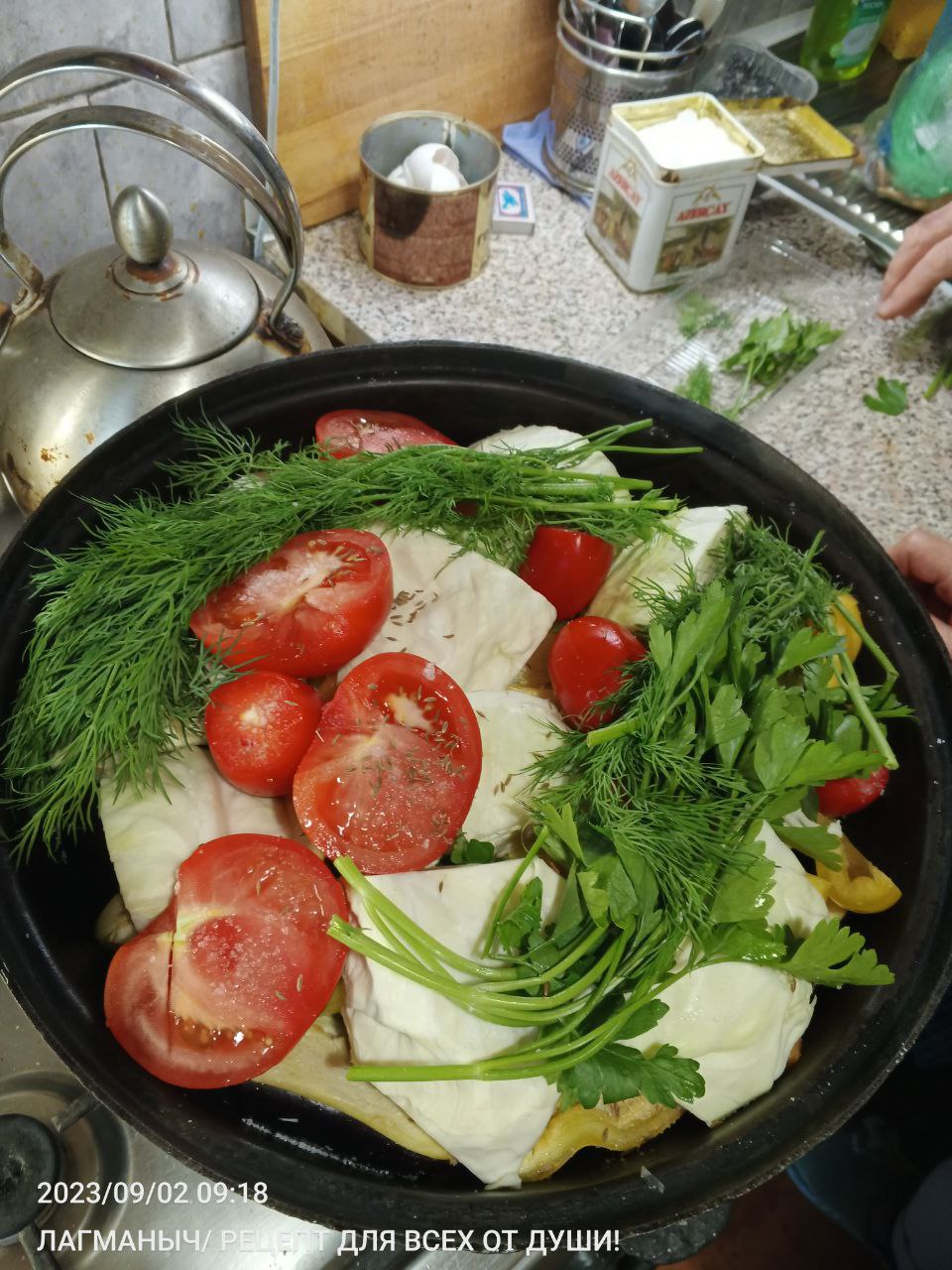 В саммом конце кладём сверху баклажаны, помидоры и зелень накрываем крышкой и ставим на средний огонь на 2 часа