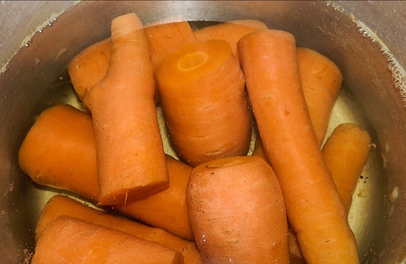 Морковь кладём в кастрюлю, заливаем водой, чтобы она покрывала овощи, и ставим кастрюлю на плиту. Варим после закипания 20 минут на среднем огне.