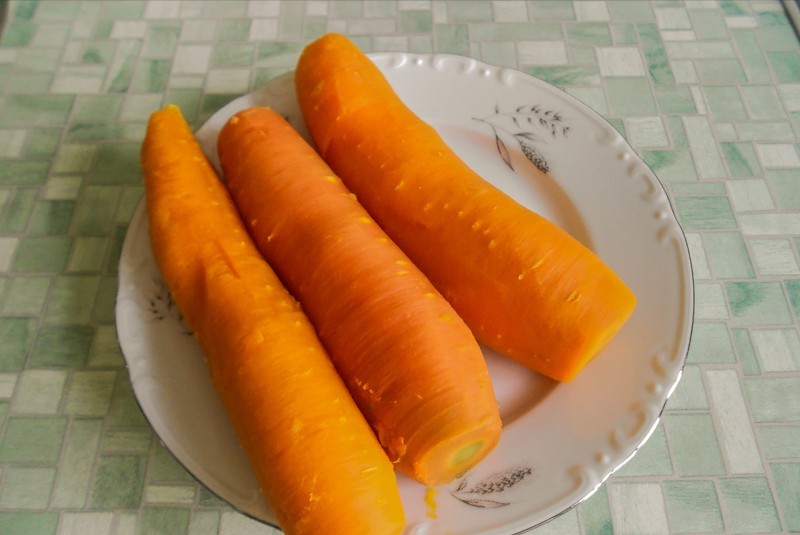 Сливаем воду и проливаем морковь холодной водой из крана, чтобы она быстрее остыла. Остывшую морковку чистим.