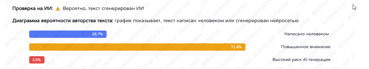 Есть гораздо лучше и умнее, на самом деле любой этот алгоритм анализа обходится при должном желании. Там на скрине видно название это один из бесплатных анализаторов. Я вообще не претендую тут кого-то судить. Вижу тело без репутации, с "нейрослопом" в работе = рэд флэг. Причины нужно пояснять? У нас есть уважаемый мод. состав они управятся авторитетно. Я лишь поделился своим впечатлением как читатель, заметим моей работы тут нет, я не стремлюсь смешать кого-то с грязью, в токсичность погружаться вообще не хочу. Когда 90% активности аккаунта это игра в слова, это о многом говорит, надеюсь понимаете что закрывать профиль нет смысла, всё видно...