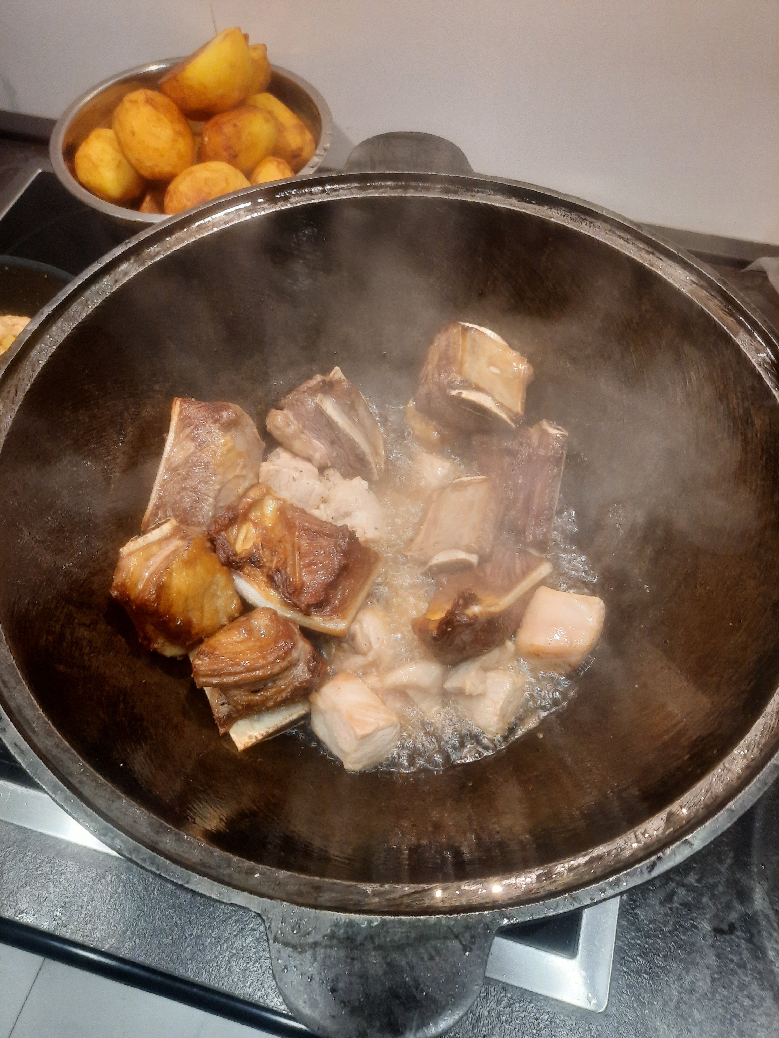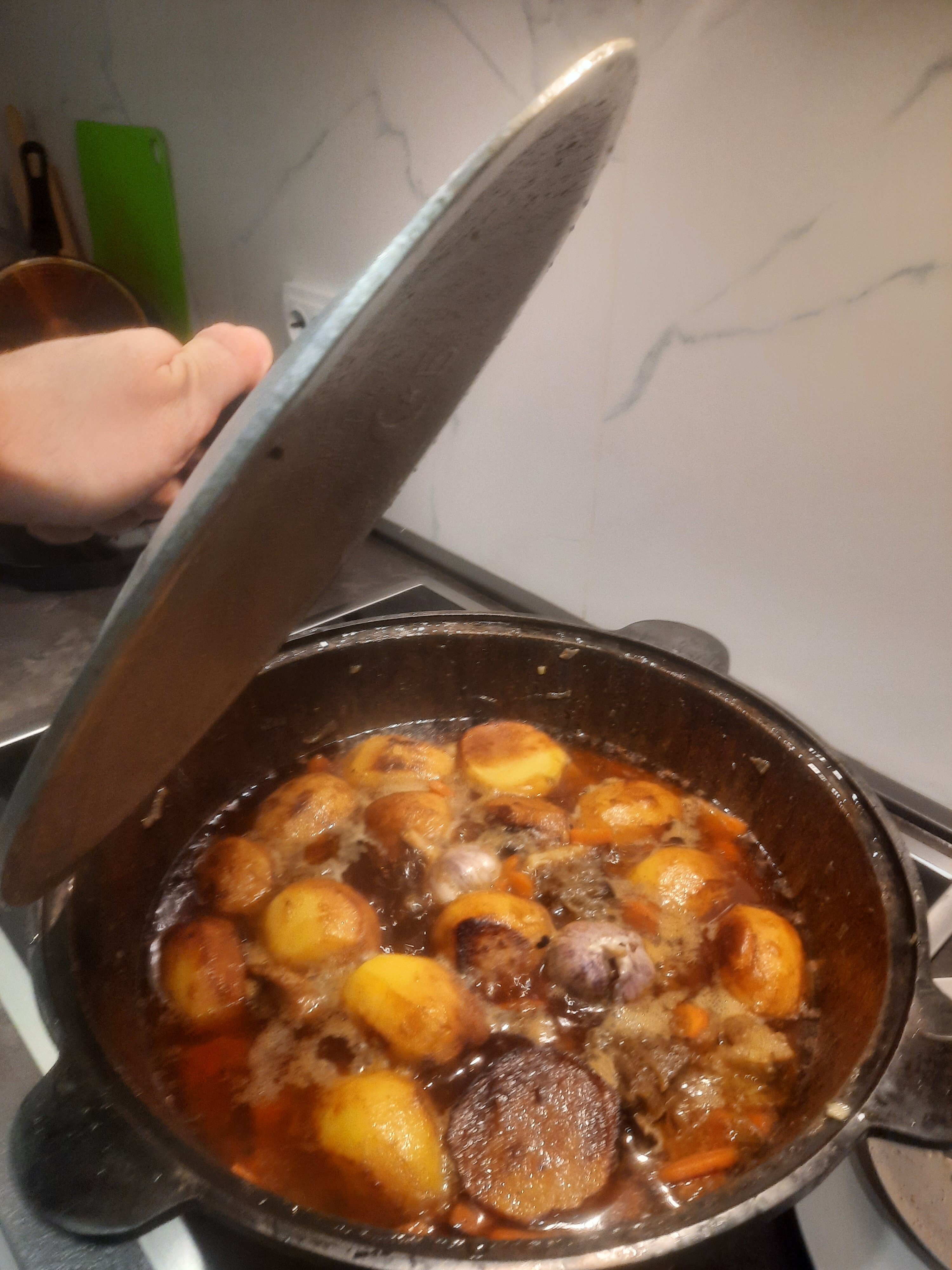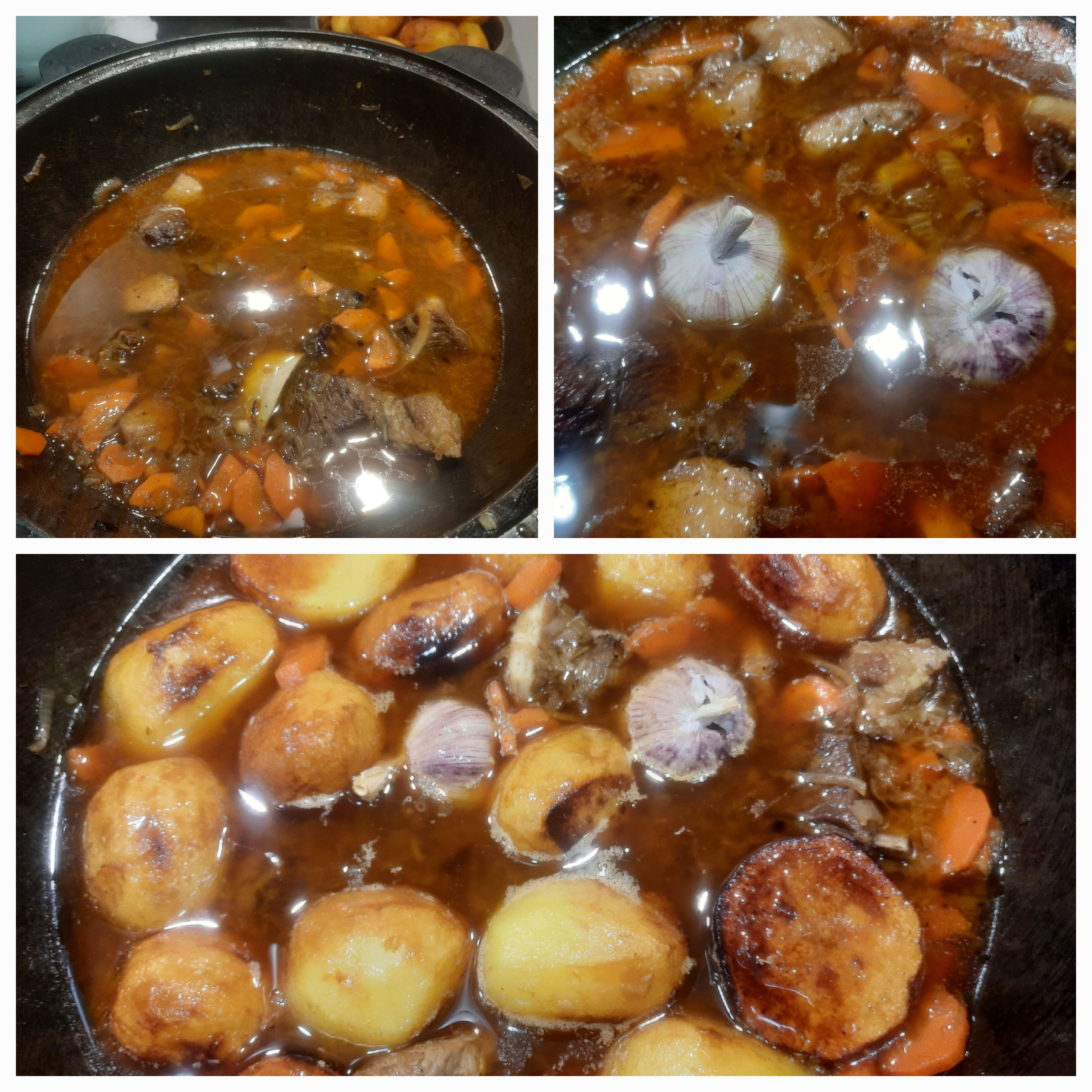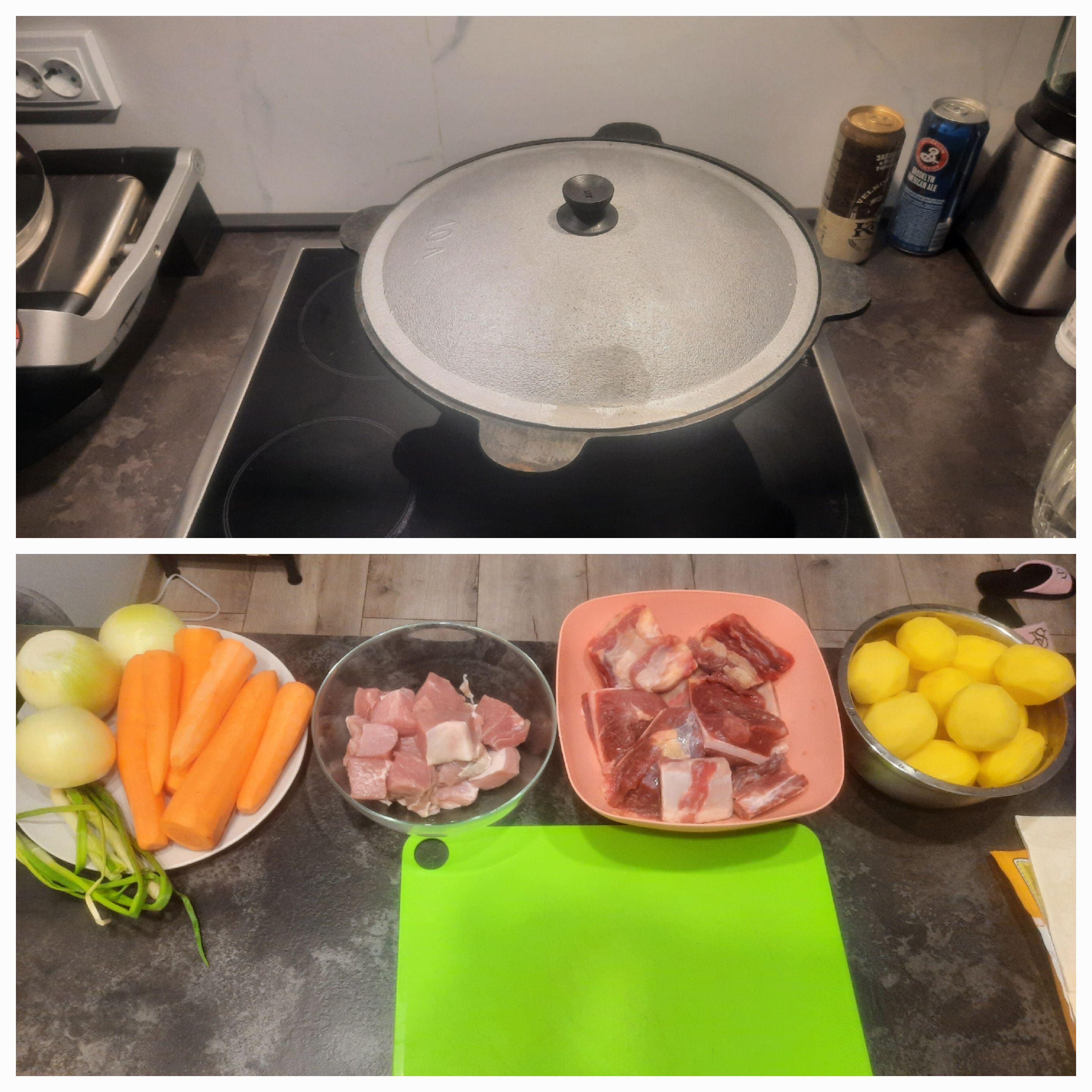 Добавив специи, наливаем кипяток чтоб покрыло наше мясо, лук и морковь. Тщательно перемешиваем, пробуем на соль и далее закидываем картофель и пару головок чеснока.