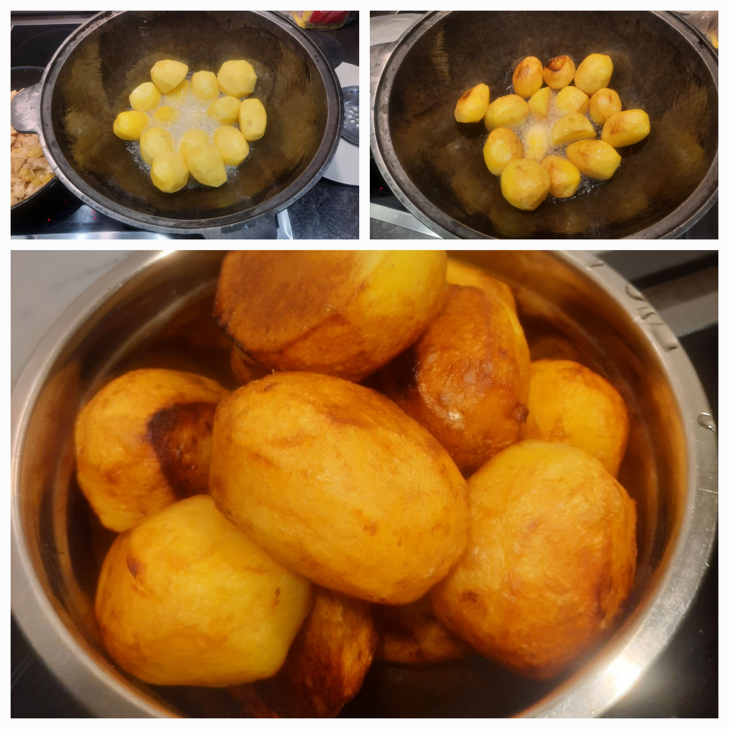 Закидываем аккуратно картофель и жарим до золотистой корочки ,но не для полной готовности картофеля. Как образовалась аппетитная золотистая корочка, вытаскиваем картофель и пока что всторону...