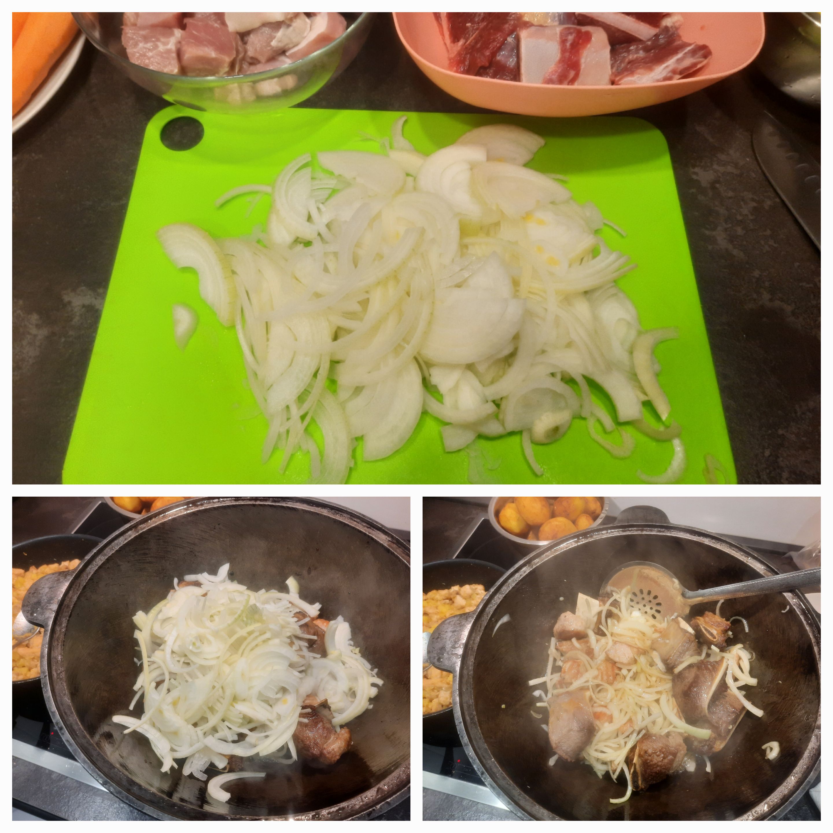 Разогреваем казан на сильном огне, предварительно налить масло по краям казана.