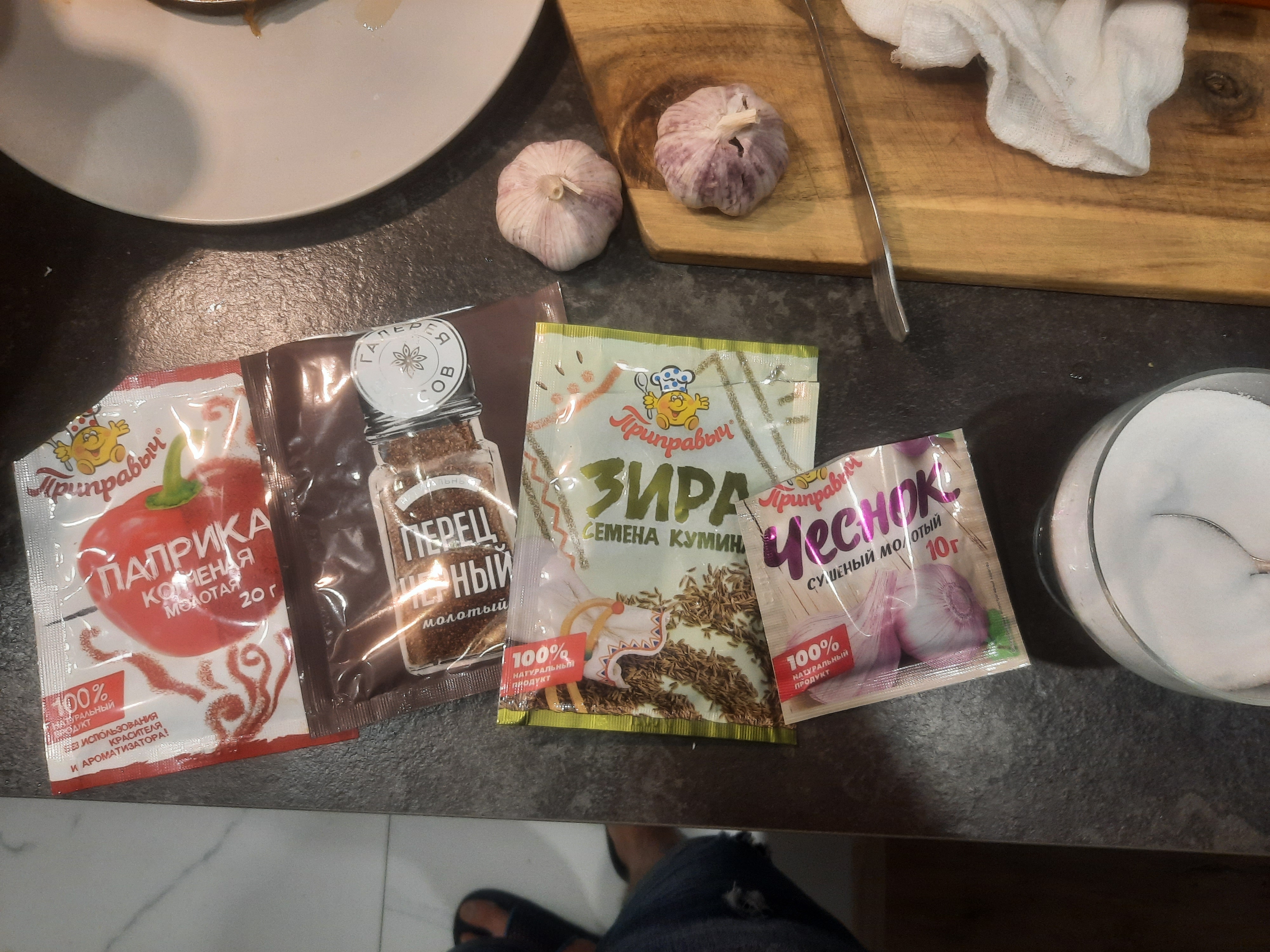 - Приправы : соль, перец чёрный, парика острая копчёная, сушеный чеснок, зира, 2 головки чеснока.