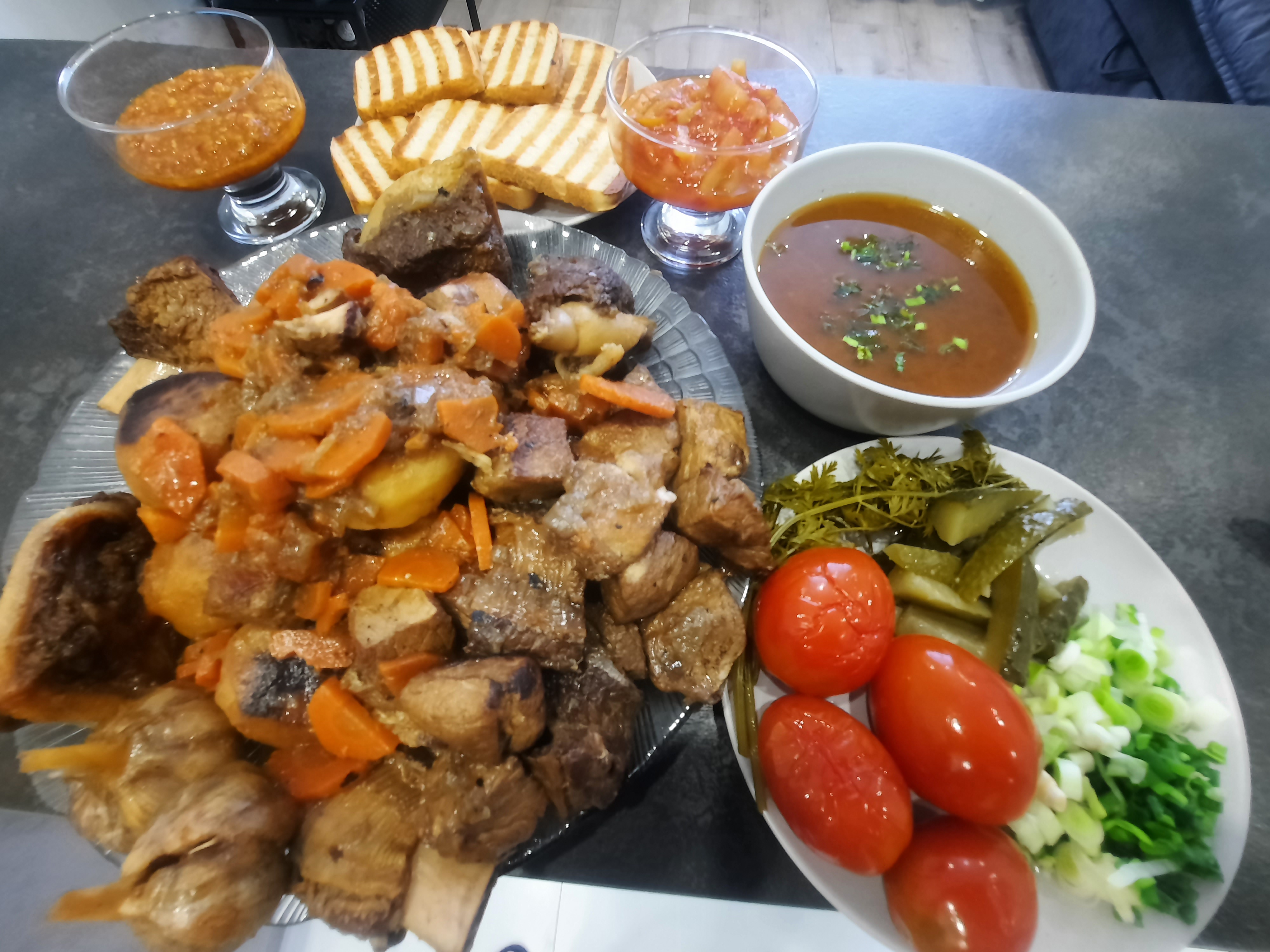 Подаю с домашними огурчиками, помидорами, аджика и лечо!!!