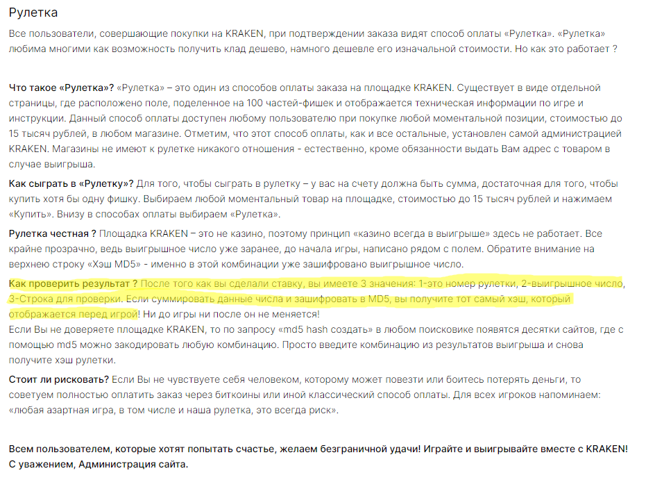 На самом разделе кракене уже написано, что в номере рулетке есть выиграшное число.
