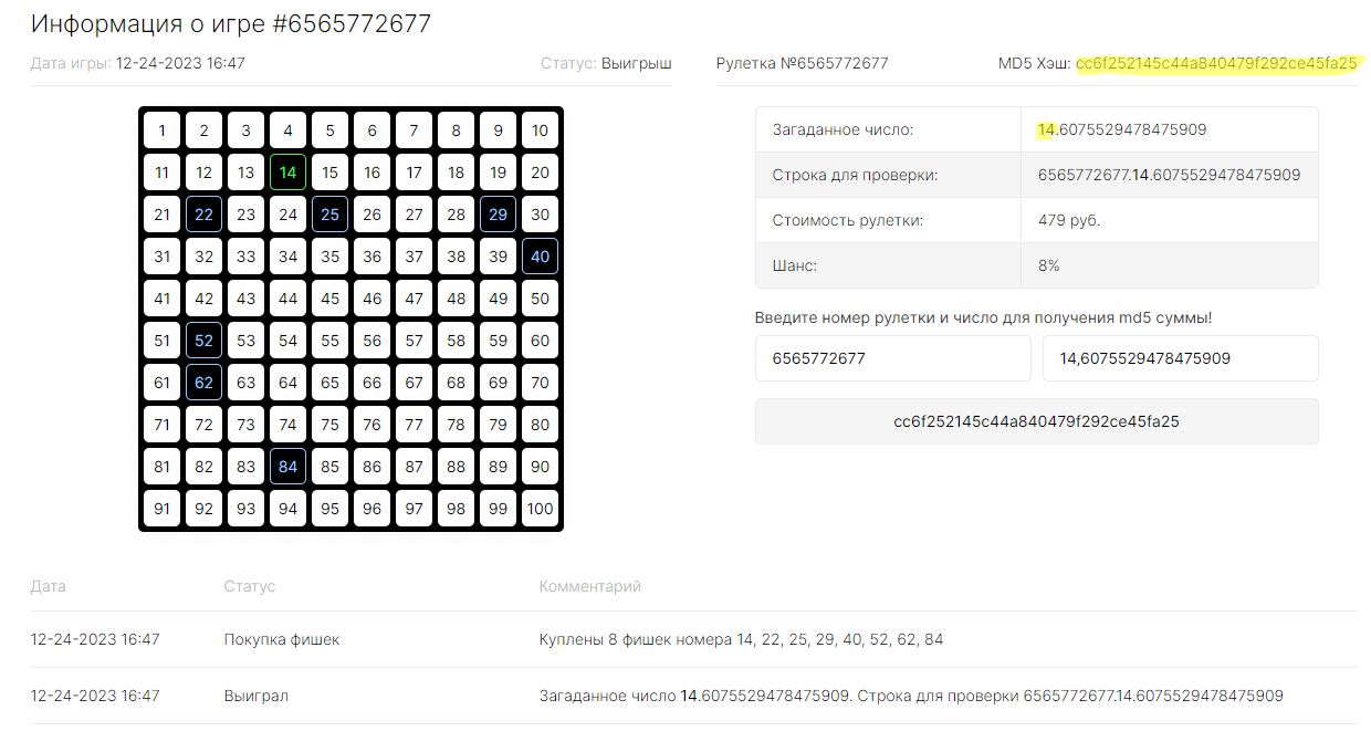 Уже не работает. Выпала цифра которой в хеше не было. Вообще как эта рулетка может быть чесной если ее подкручивают как хотят. Еще и цену на нее повысили.Надеюсь в это гомно никто не играет ибо обман