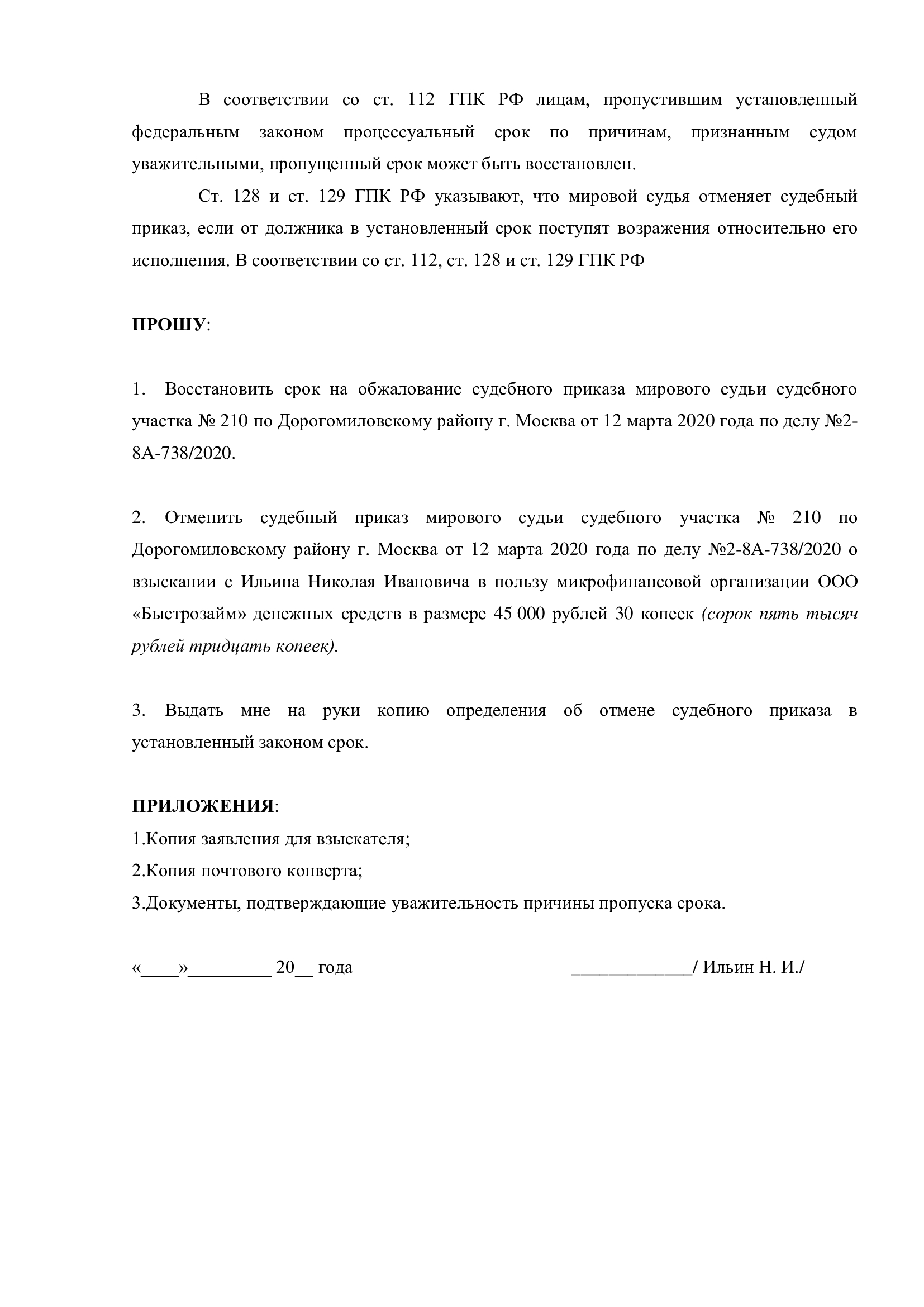 2. Когда все данные получены, необходимо восстановить сроки отмены судебного приказа по статье 112 ГПК РФ и написать заявление об отмене суд. приказа. По сути - это два разных документа, но можно это все вместить и в один документ. Оба образца написания этих бумаг прикрепляю в спойлерах ниже;