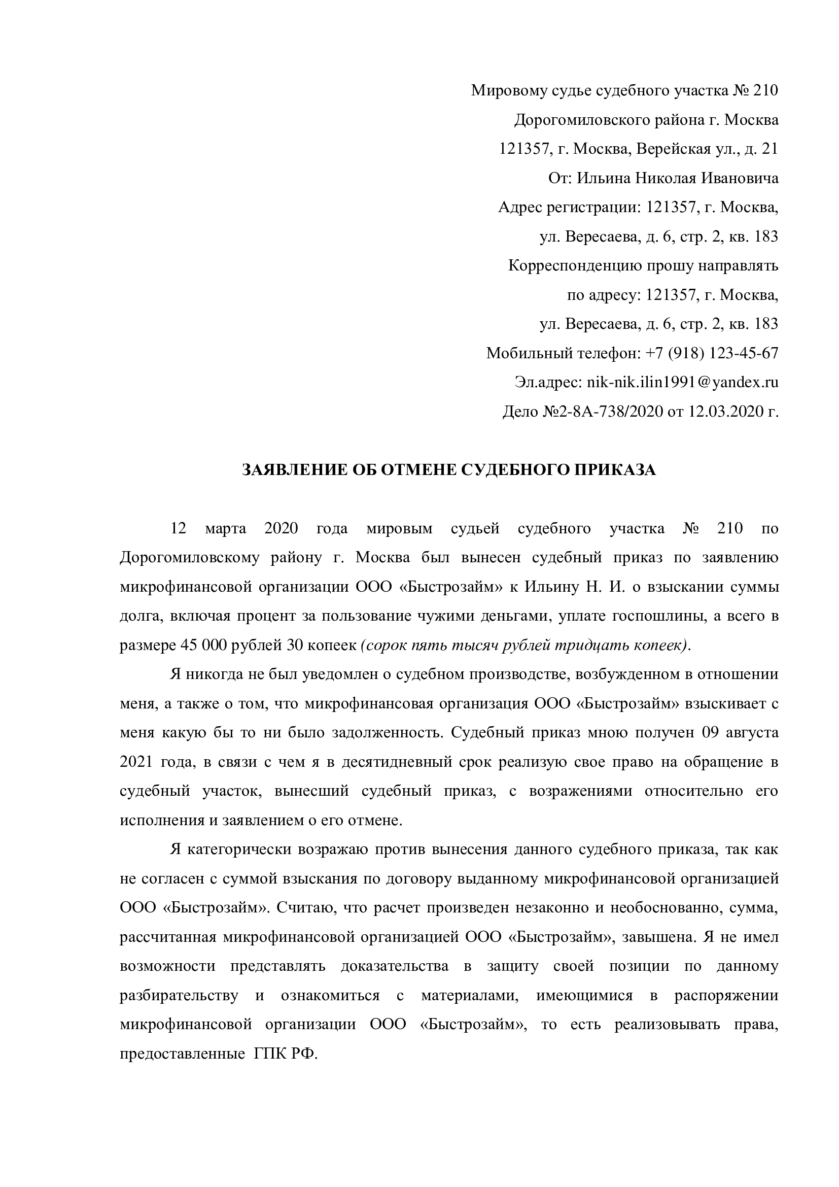 Всем салам! 10 дней назад по предложенным ТС образцам написал три ходатайства на отмену судебных приказов. Сегодня забрал из почты три постановления о отмене данных приказов. Спасибо за данную подсказку.