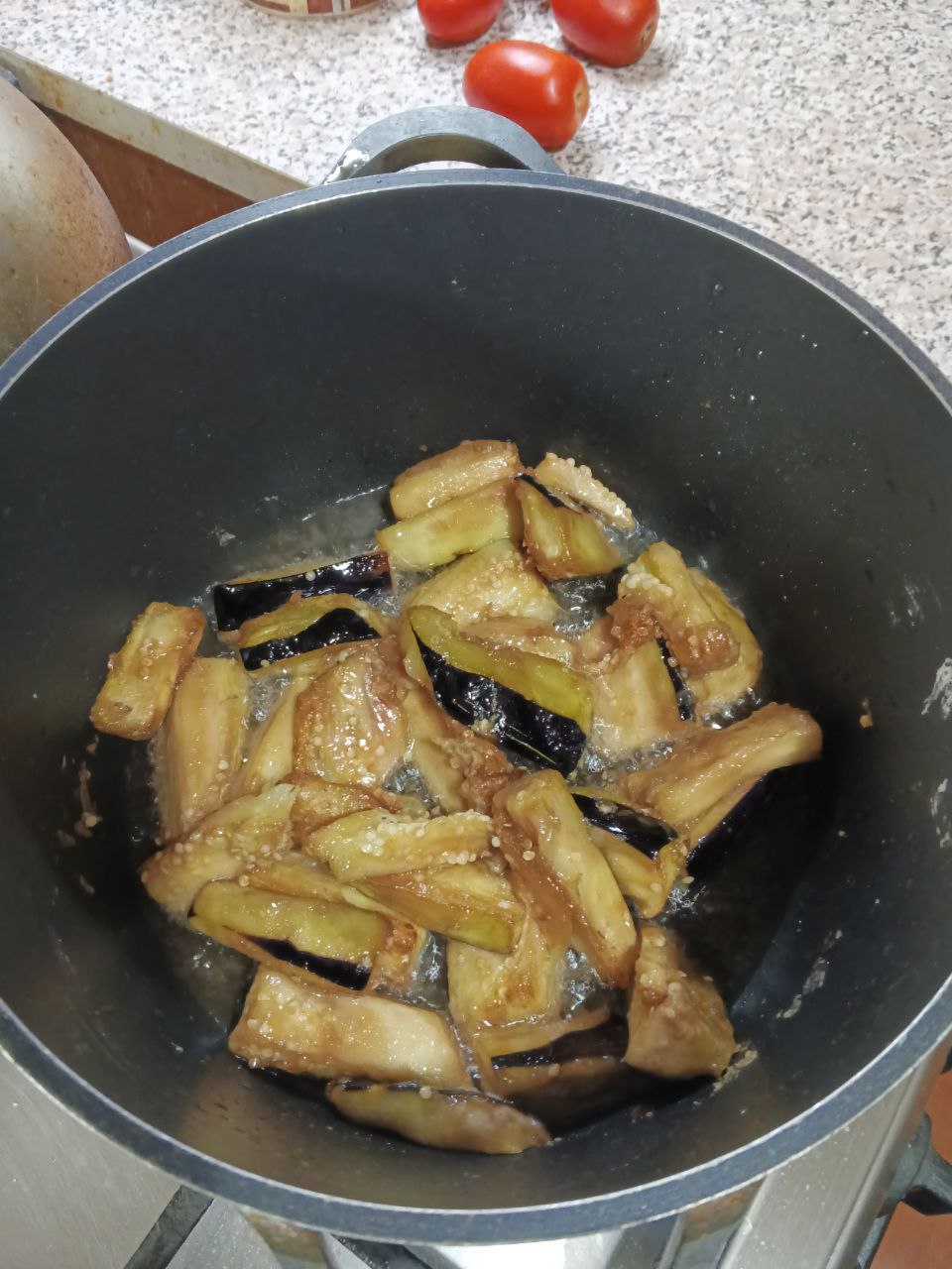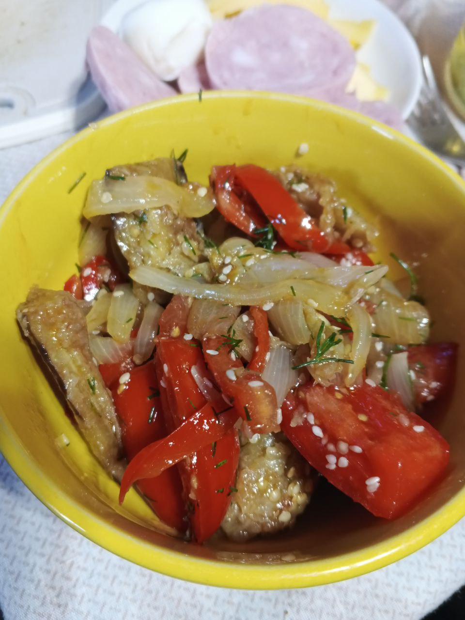 Когда лучок станет прозачным вытаскиваем овощи к баклажанам