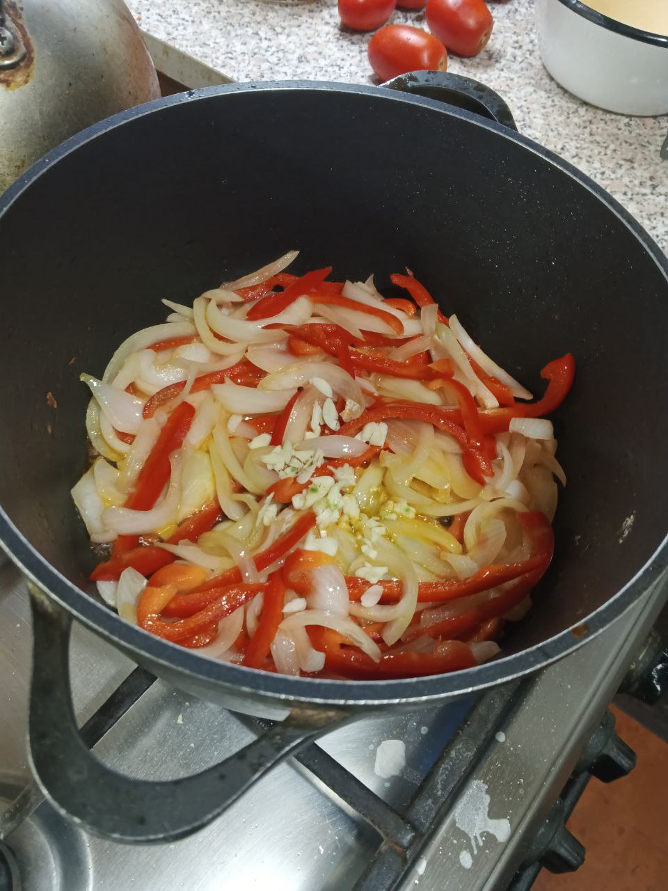Теперь обжариваем репчатый лук, болгарский перец , солим сразу добавляем ческок и молотую кинзу